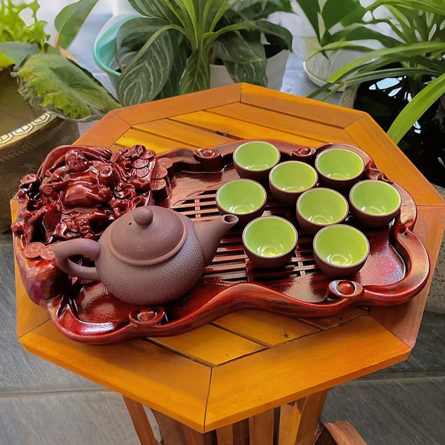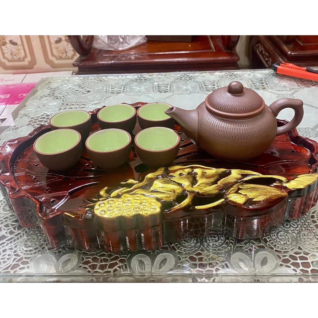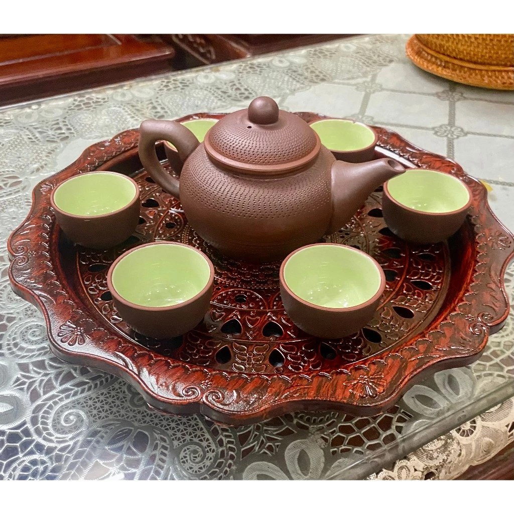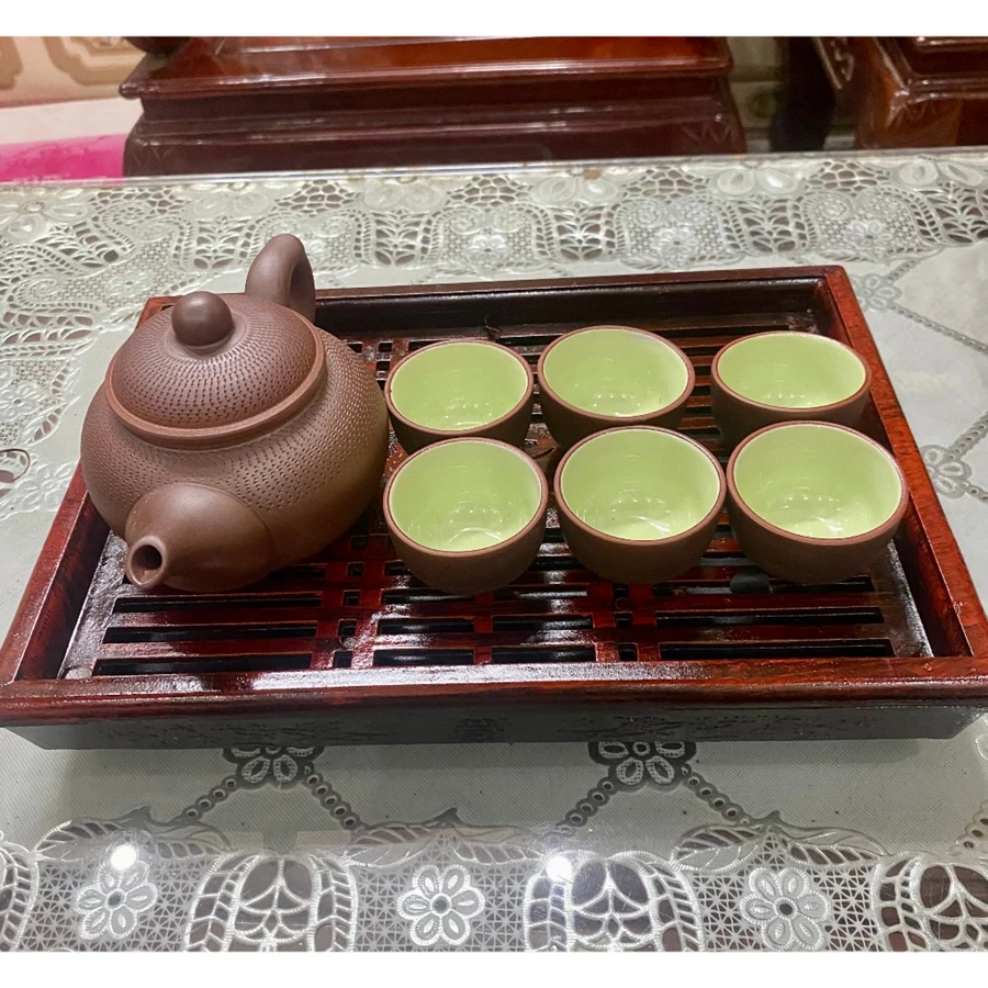 - Bộ sản phẩm gồm đủ tiện ích: gồm 1 ấm trà vừa tay cầm, 6 chén phù hợp cho buổi trà gia đình hoặc đãi khách, và đi kèm là khay gỗ tiện lợi – giúp giữ sạch, tránh tràn nước và dễ trang trí không gian thưởng trà.